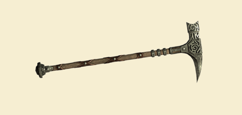 A two-handed axe with a larger steel head and a longer wooden shaft, wrapped in brown or black leather.